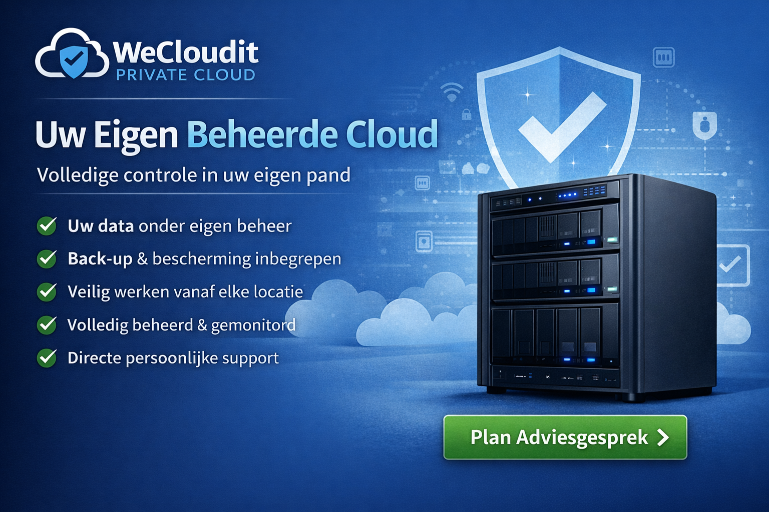 WeCloudit levert, onderhoud, support en update uw eigen private cloud (op afstand). Zo is veiligheid en continuiteit gewaarborgd. Door de dagelijkse backups gaat er nooit data verloren, wel een gerust idee. Gaat er wat mis? Dan grijpen we snel in zodat u weer snel verder kunt.
